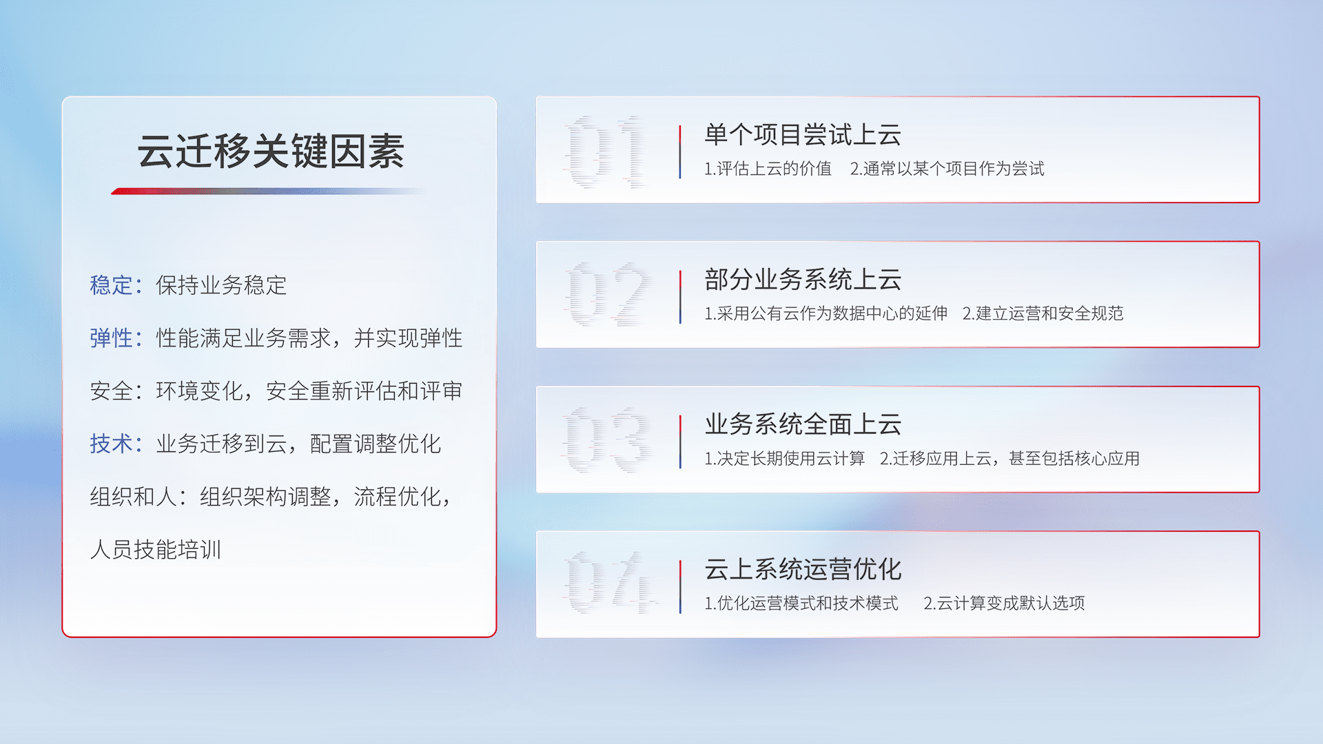 结合实际业务,,,,从规划设计、、云平台选型、、、、云原生改造、、、、数据迁移、、、、集成交付,,迁移全过程为客户识别最佳上云路径,,,,做好风险识别管理,,,设计网络架构、、身份权限、、安全审计合规、、操作审计、、、、日志审计、、、、监控告警策略、、、多站点容灾设计等,,,对云上基础设施进行整体规划,,,提升IT治理水平,,,,以满足弹性、、、、高可用、、、、高性能的需求。。