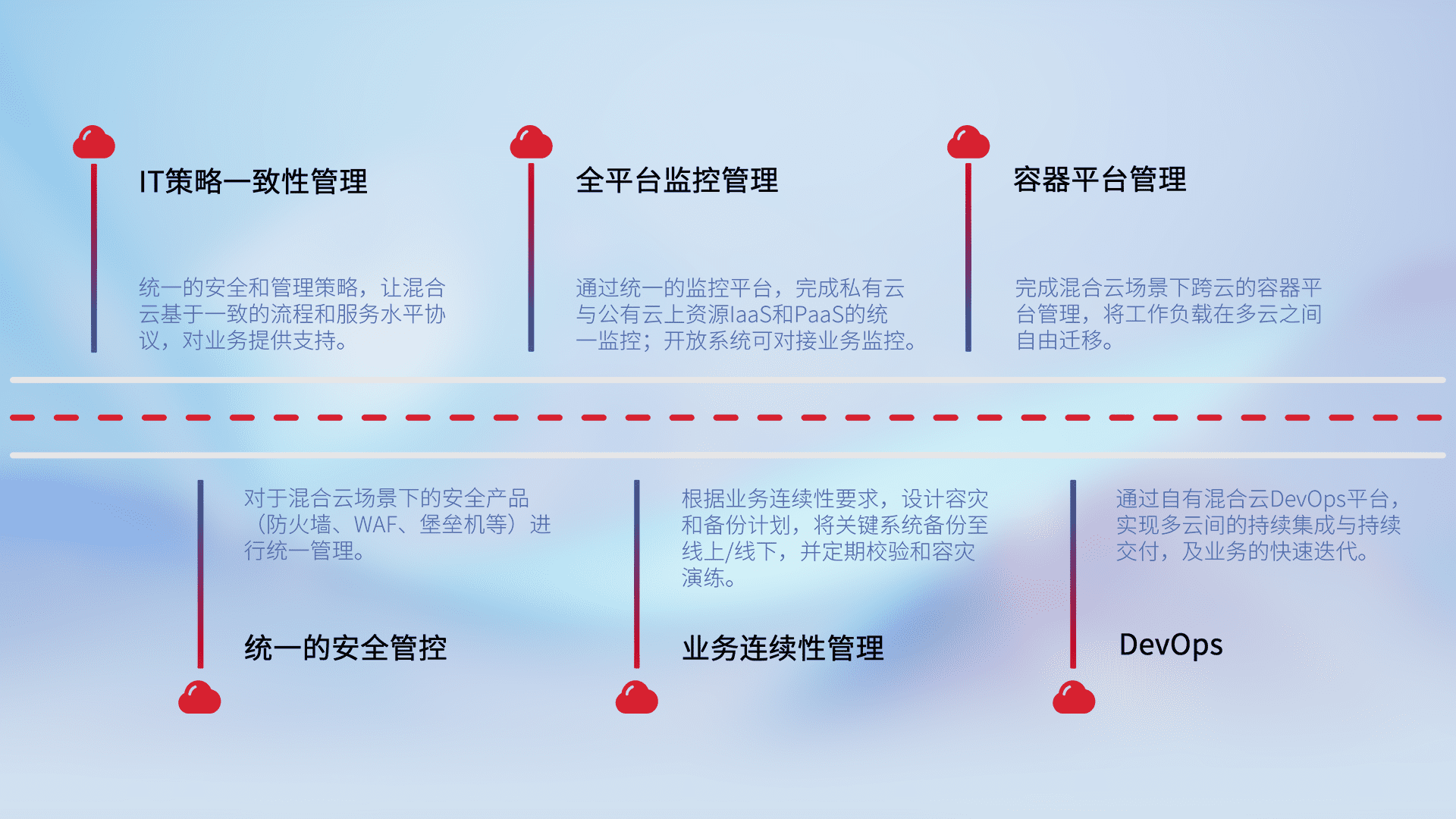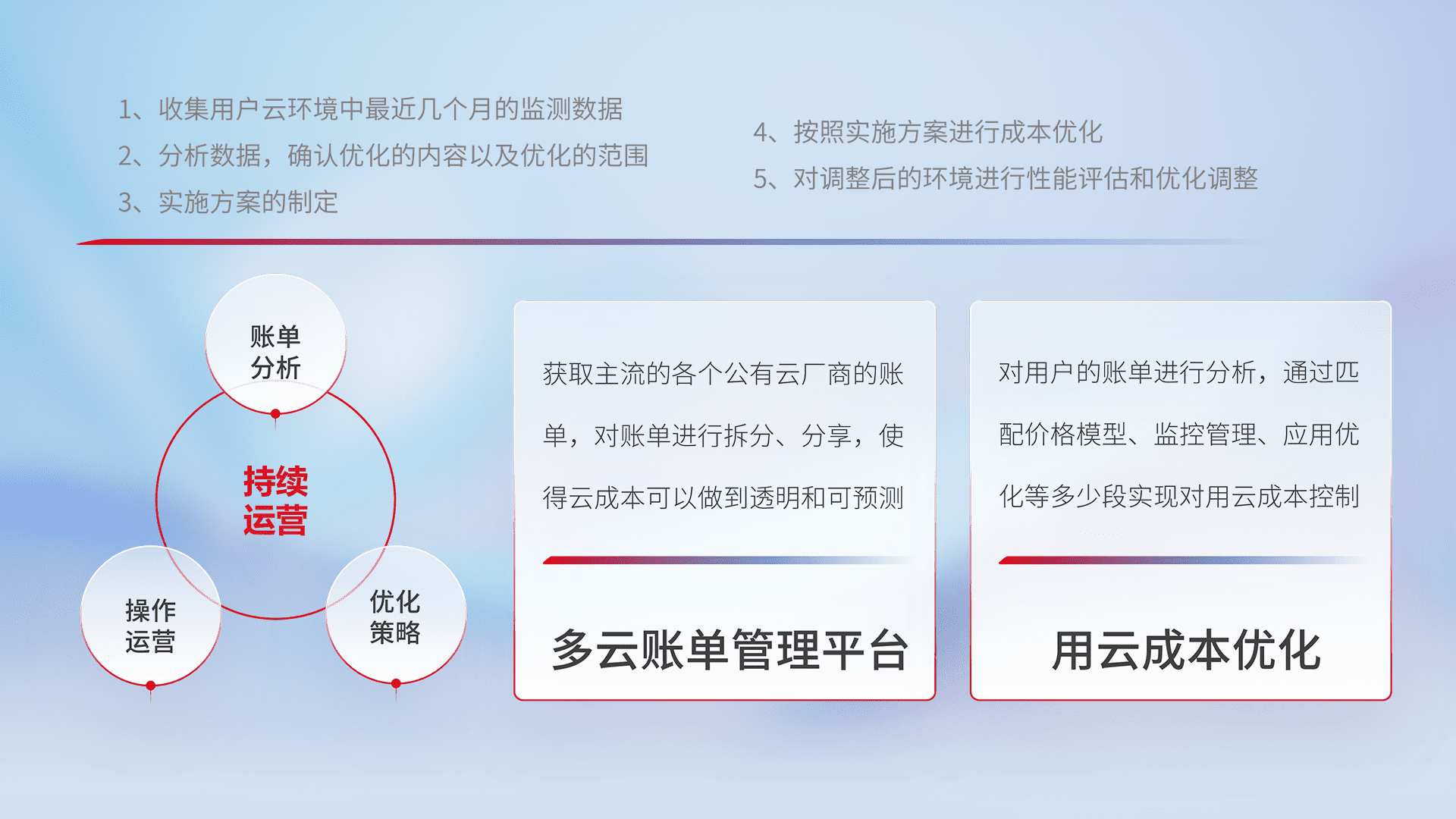 通过多云纳管,,以统一的资源数据模型把客户的云资源进行抽象和封装,,,,进而实现对多云资源的统一操作,,,,保障云资源管理的可靠性、、、稳定性与可用性。。量身定制化运维内容,,配置、、、开发运维、、补丁管理、、、备份、、、、监控、、认证和访问管理、、、、审计和日常巡检等,,,保障在用云过程中的可靠度,,,,稳定度以及高可用率。。。