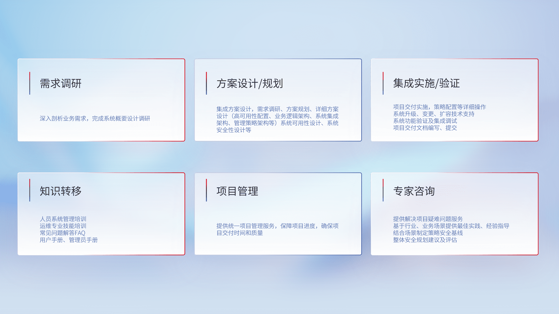 针对客户行业特性,,,,将宏观的安全战略和需求,,通过专业的交付服务,,,,实现项目落地,,,为客户提供标准规范的集成交付服务。。。